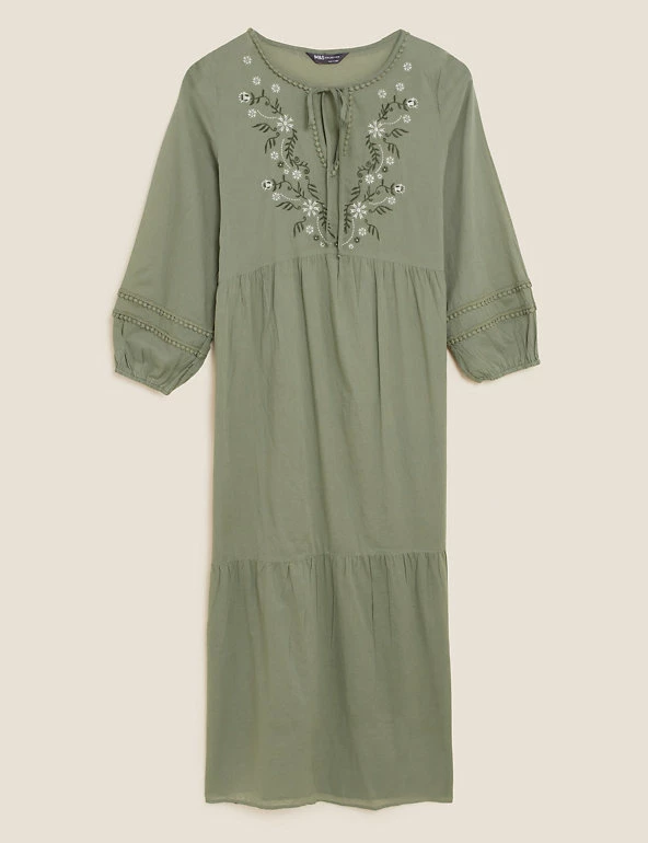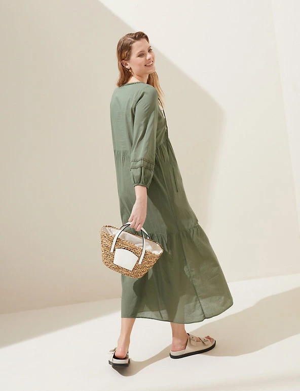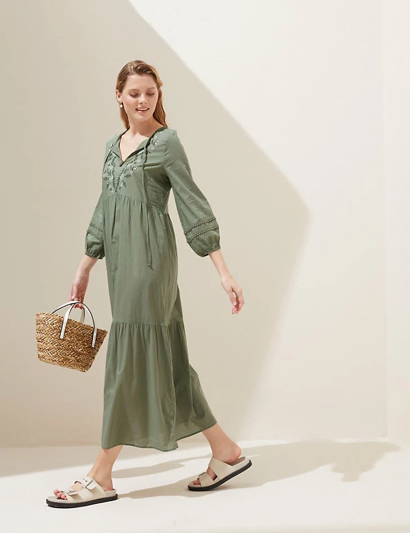 Pull on this pure cotton maxi beach dress for a laid-back look. It has a regular fit, with a tie-waist and subtle tiers for flattering shaping. Embroidery around the v-neck and lace trims on the long sleeves provide a feminine finish. We only ever use responsibly sourced cotton for our clothes.