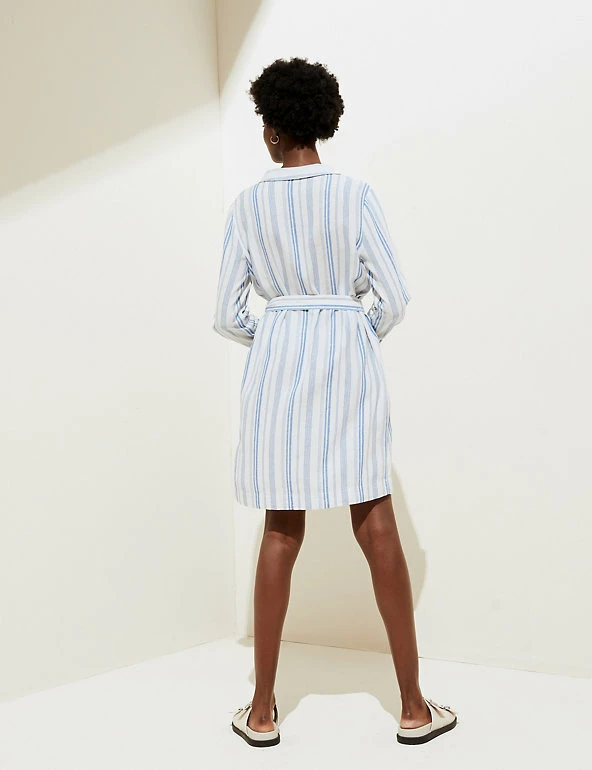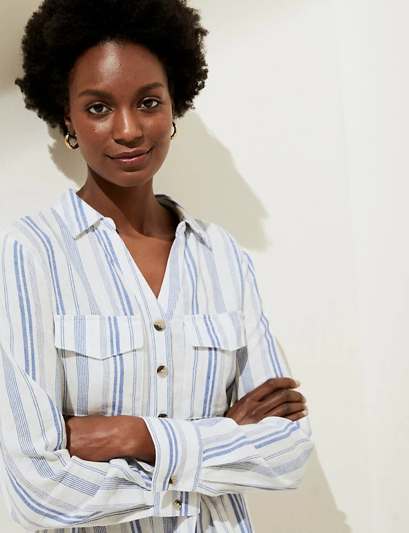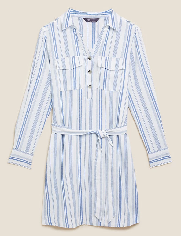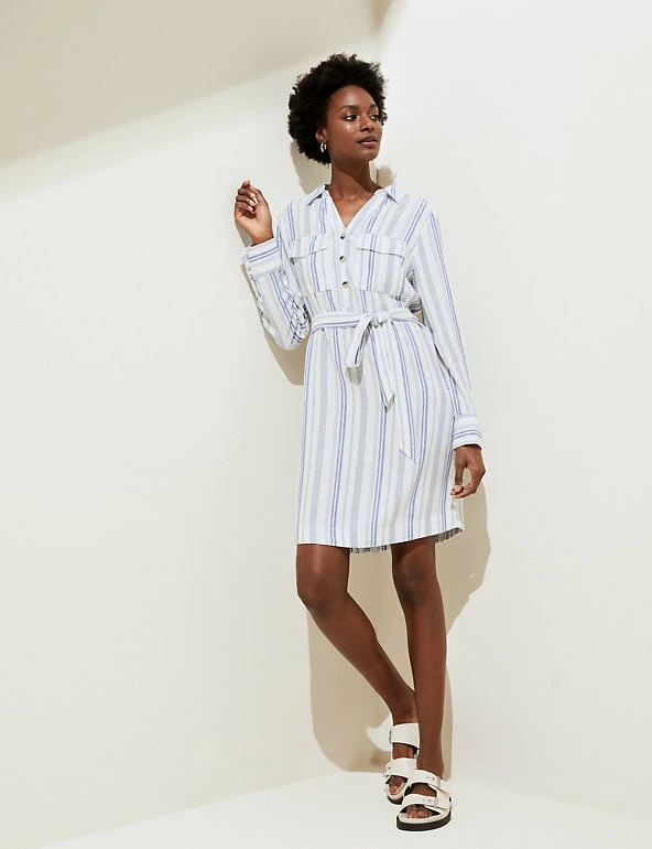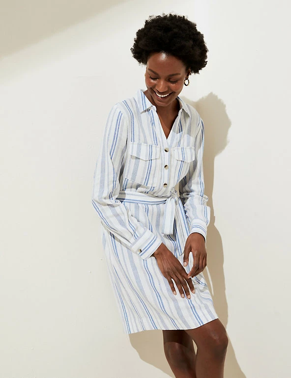 No warm weather wardrobe is complete without this striped linen-rich shirt dress. This regular-fitting piece has a versatile knee-length hem along with a smart collar and classic button fastenings. A matching tie belt enhances the waist, and two patch pockets on the chest add a laid-back feel to this utility-inspired style. Made with sustainably sourced viscose.