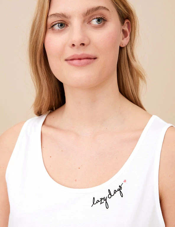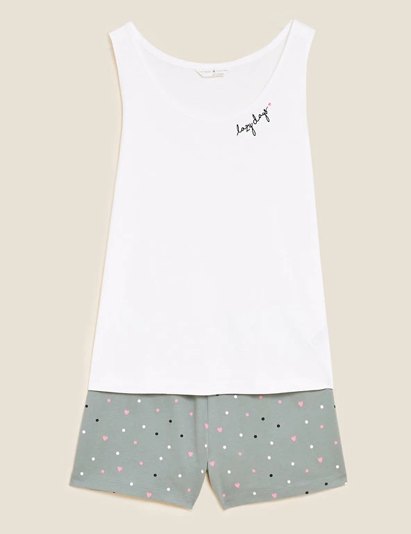Feel comfortable on warmer nights in these pure cotton shortie pyjamas. Easy regular fit with an elasticated waist on the spot-print bottoms. Plain vest top is embroidered with the slogan ‘lazy days’ by the neckline. We only ever use responsibly sourced cotton for our clothes.