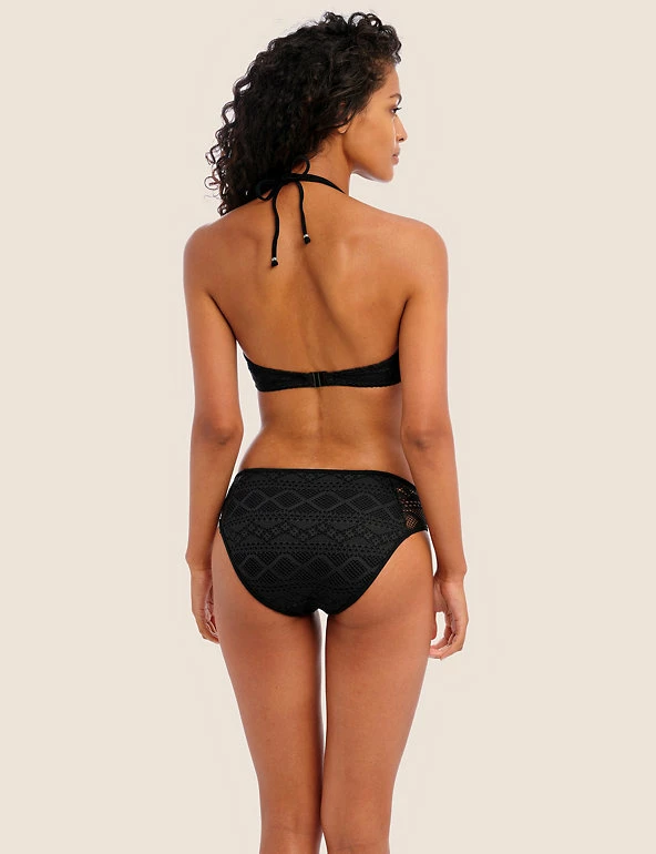 Channel timeless elegance in these crochet bikini bottoms by Freya. They sit on the hips, with a flattering cut at the leg and good coverage at the back. Sheer detailing at the sides lends a delicate touch, while the front and back are lined for comfort and modesty.