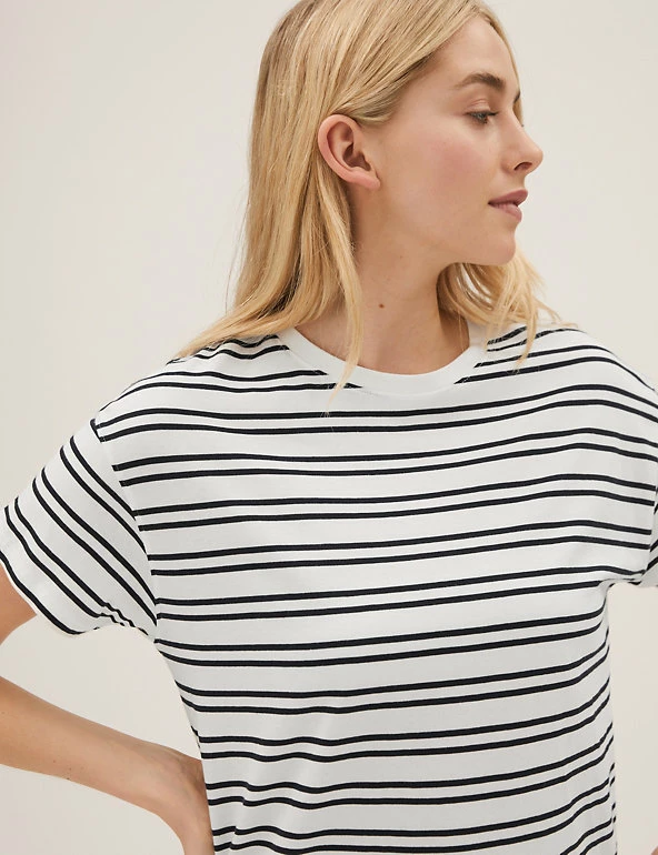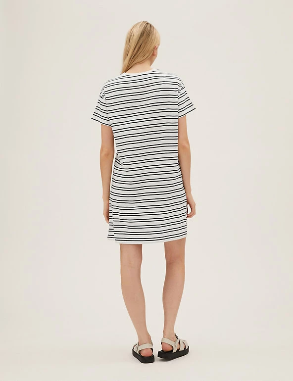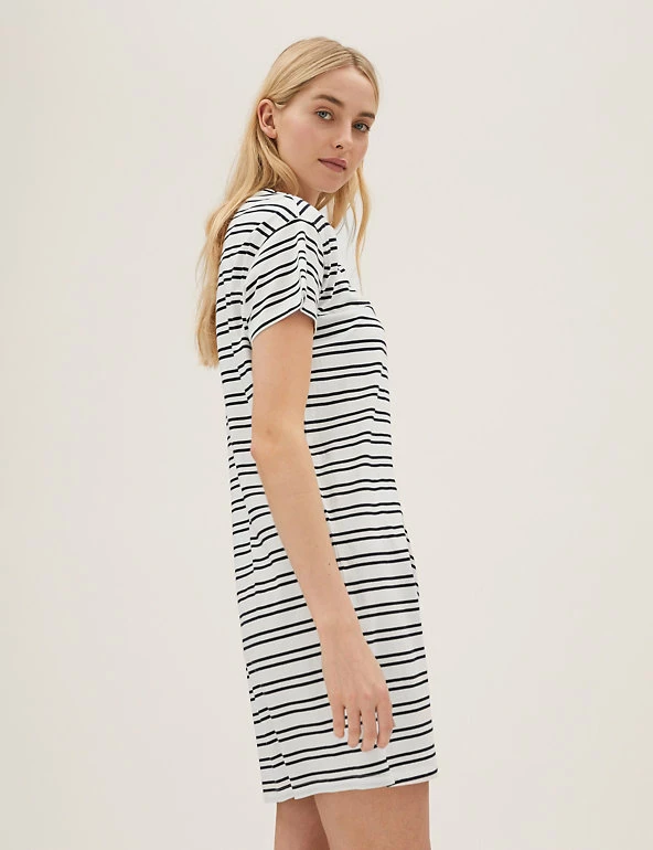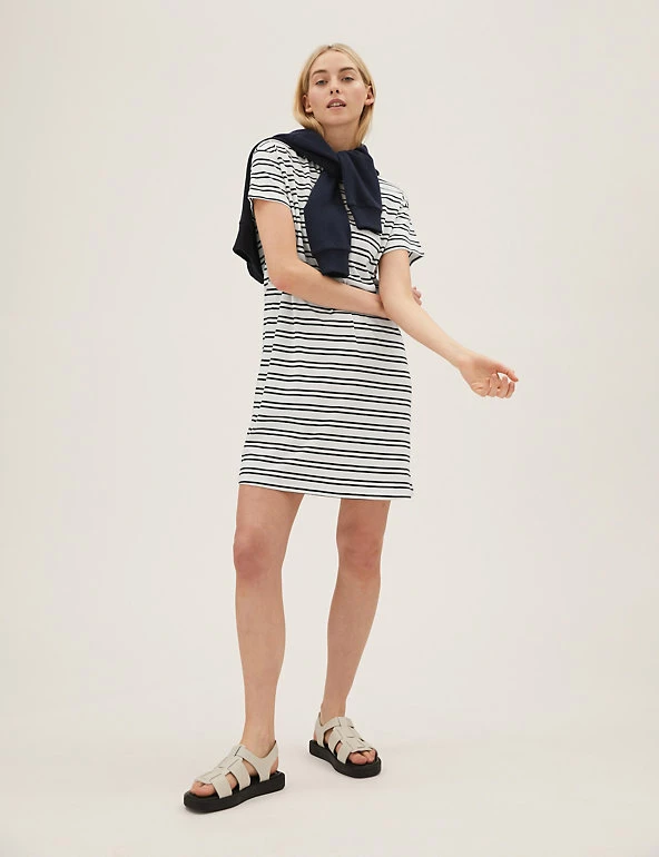 No wardrobe is complete without a striped pure cotton t-shirt dress. This one is made in a regular fit and versatile knee length. It has a neat round neck for easy wear. The breezy short sleeves feature stripes running in a contrasting diagonal line to the body for a jaunty touch of detail.