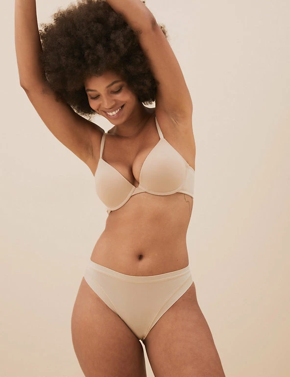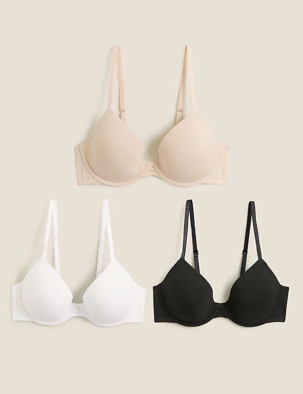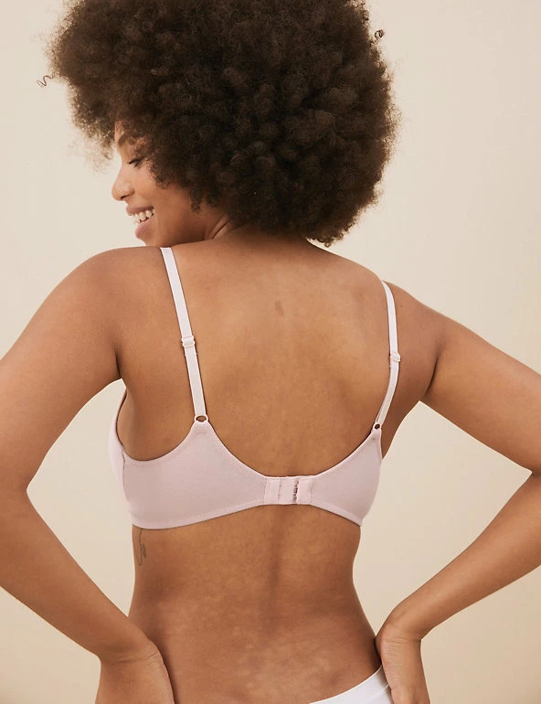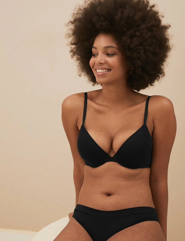 These cotton-rich padded t-shirt bras will give a smooth look under clothes. Plunge style that enhances your natural figure. Underwiring provides extra support. We only ever use responsibly sourced cotton for our clothes.