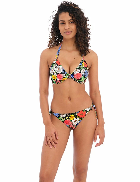 This plunging bikini top by Freya has a bold floral print for an instant statement feel. Designed with powernet-lined, underwired cups, it’s made to fit a fuller bust. The top has a halter tie closure around the neck and playful cut-out detailing on the front.