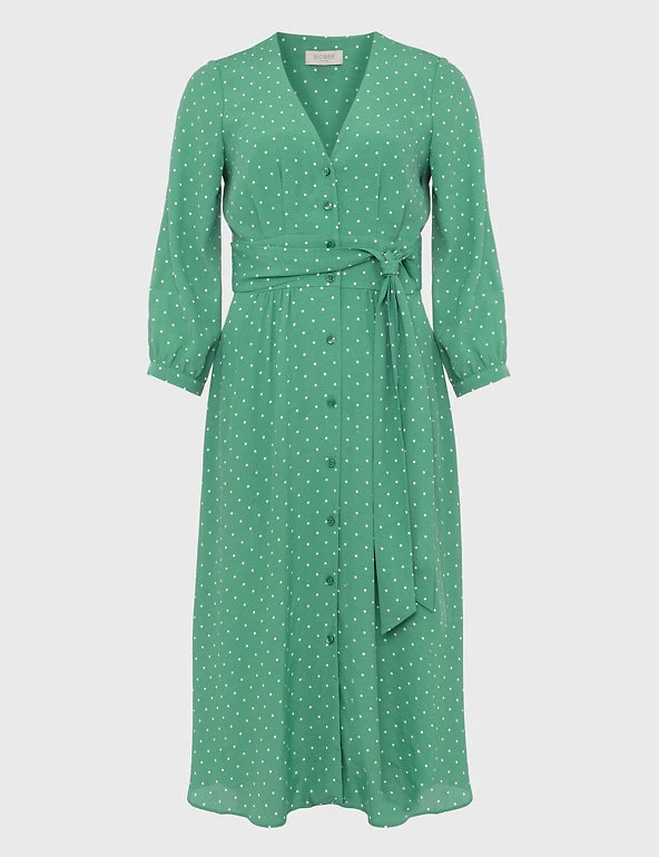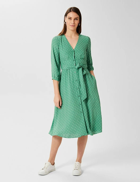 This pretty shift dress by Hobbs exudes charm with its classic polka-dot print. Cut to a regular fit, it drops to a sophisticated midi length. It features a flattering low v-neckline, contemporary button-through closure and smart three-quarter sleeves. A self-tie belt at the waist draws in your figure for a flawless look. Made with sustainably sourced viscose.