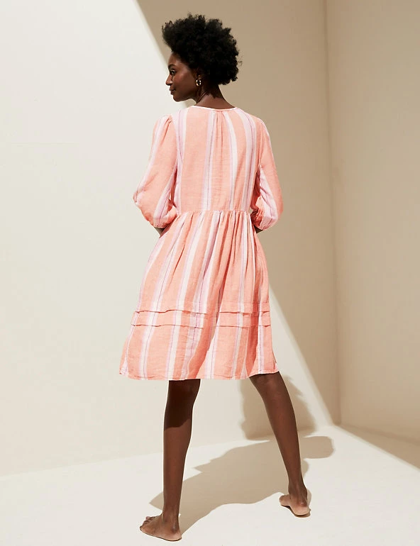 Classic stripes and tiered detailing give this linen-blend dress a timeless look. The regular-fit piece falls to a playful mini length and features a v-neckline with sophisticated tie. Three-quarter length sleeves create a laid-back look. Made with sustainably sourced viscose.