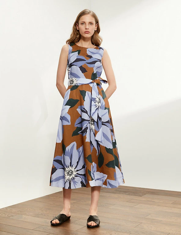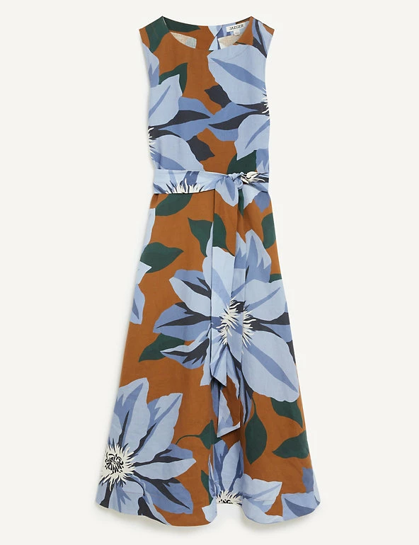 Make a summer statement with this pure linen skater dress from Jaeger. Crafted from cool linen in a regular fit, it features a flattering sleeveless bodice and matching waist tie. The midi-length skirt is gently flared, creating a classic silhouette that will take you from day to night with ease. Inspired by a style from the brand’s vast archive, the beautiful floral print is unique to Jaeger. This piece is finished with an eye-catching keyhole detail at the back as well as two handy pockets. Dress it up with heels or go for a more casual look with a pair of understated trainers.