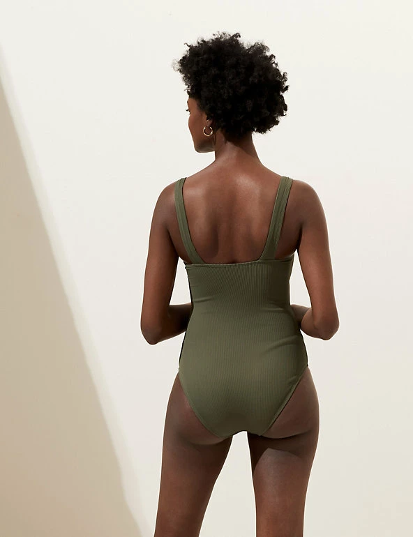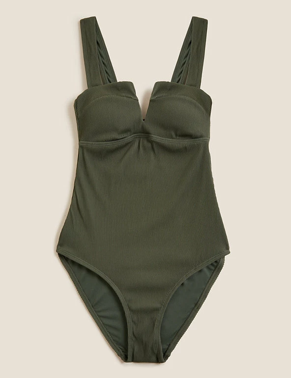 Make a splash with your poolside style in this classic ribbed swimsuit. Regular fit design, with a v-shaped plunge neckline for a flattering and sophisticated look. Padded and non-wired, with added stretch for extra comfort. Our StayNew™ chlorine-resistant finish ensures the fabric stays looking as good as new for longer.