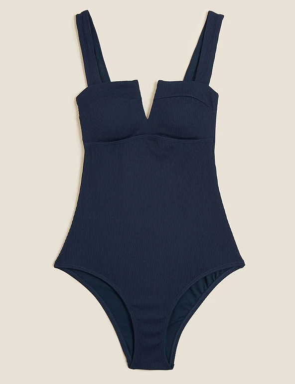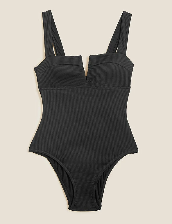 The ultimate little black swimsuit, this design is as flattering as it is comfortable. Ribbed fabric ensures super comfortable, accommodating wear. V-shape plunge with built-in pads gives your bust a supportive lift. Chlorine-resistant StayNewโข fabric helps it stays strong and stretchy, as well as pristine, swim after swim.