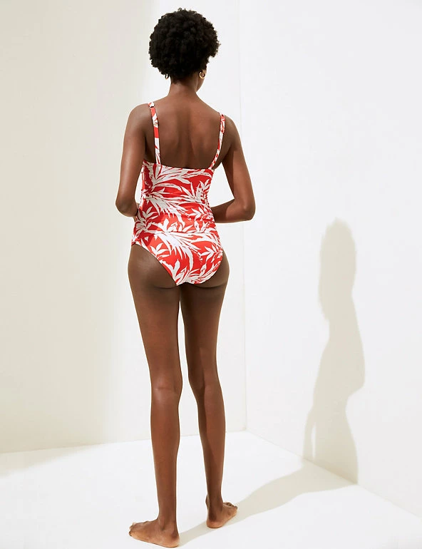 A vibrant leafy print gives this tankini top a tropical summer look. Regular fit, with a plunging v-neck and adjustable straps for a comfortable fit. Magic 360 Tummy Control technology creates flattering shaping and includes hidden power mesh for a streamlined look. Fully lined, with padded cups and added stretch for comfort. Chlorine-resistant elastane keeps it looking fresh. M&S Collection: versatile styles in modern shapes with unique and playful details.