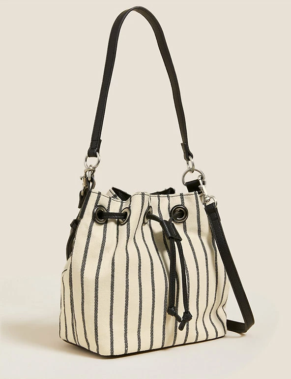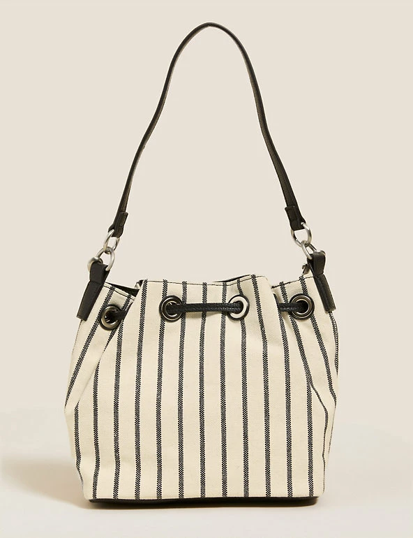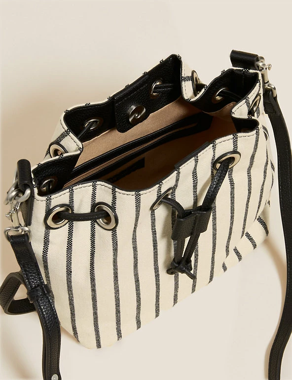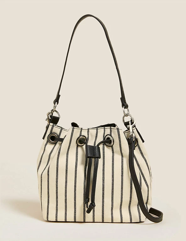 Smart stripes give this canvas bag a standout look. It features a shoulder strap and a second, detachable cross-body strap that can be adjusted to the perfect length. The drawstring fastening is secured with a magnet, and an internal zipped pocket keeps essentials safe. Contrasting faux leather trims offer a stylish finish.