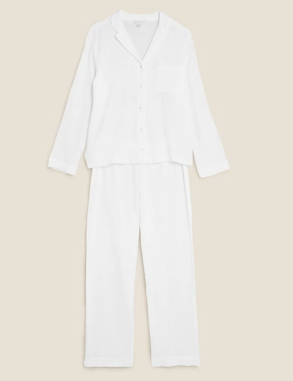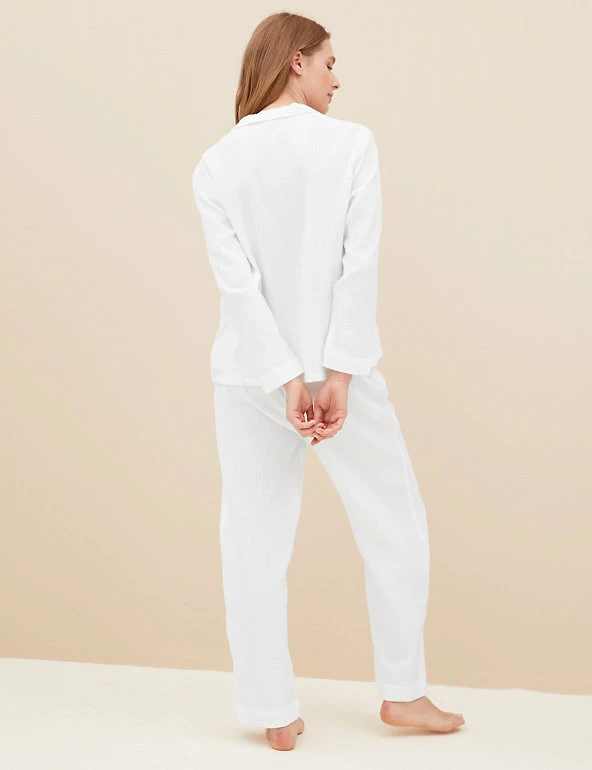 These lightweight and breathable cotton muslin pyjamas will help you relax in style. Regular fit set, with a long-sleeved shirt featuring a chic rever collar. Long-length bottoms have a comfy button fastening. We only ever use responsibly sourced cotton for our clothes. M&S Collection: versatile styles in modern shapes with unique and playful details.