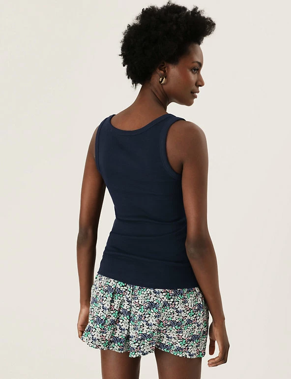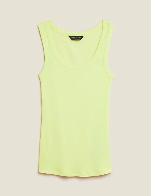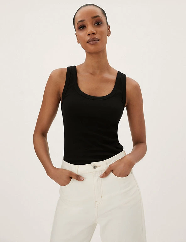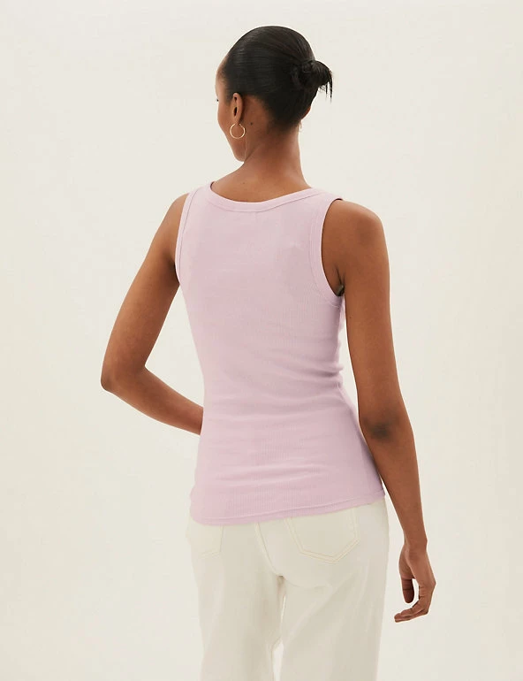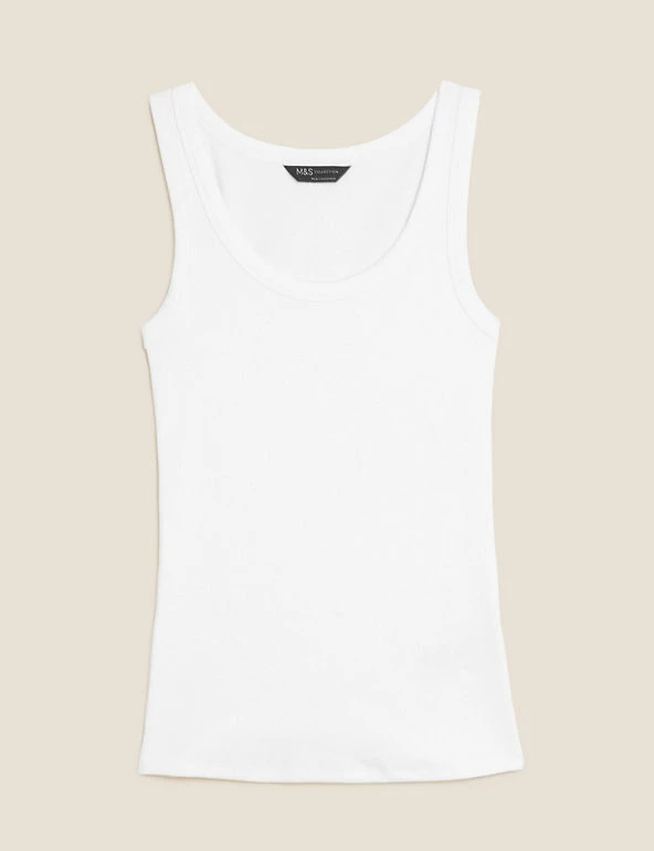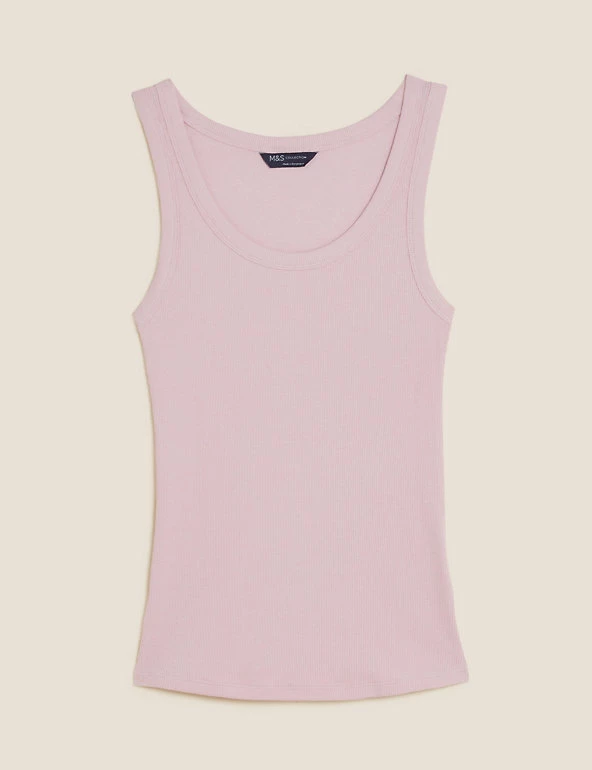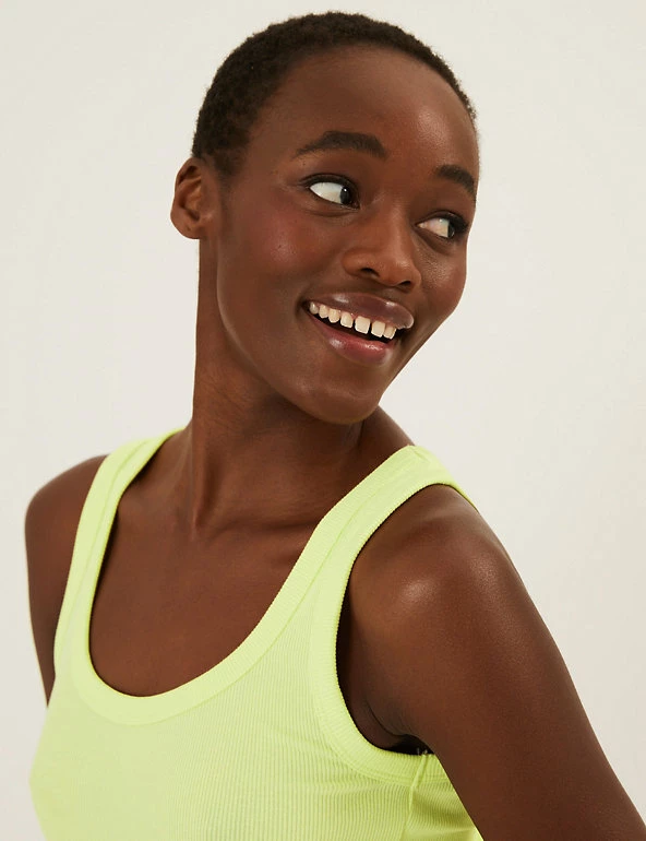 Cotton-rich fabric ensures this ribbed vest top feels wonderfully breathable. Fitted style, with added stretch for comfort and a flattering scoop neck. We only ever use responsibly sourced cotton for our clothes.