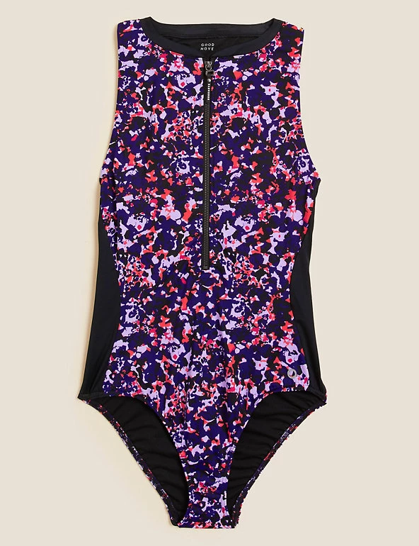 With its bold print, this flattering swimsuit from our Goodmove range is the perfect choice for pool laps. The playful piece is designed in a regular fit and features a contemporary high neck design. Added stretch offers ultimate comfort, while chlorine-resistant fabric means it’ll feel like new for longer. It’s finished with a sleek zip-front closure for easy on and off.