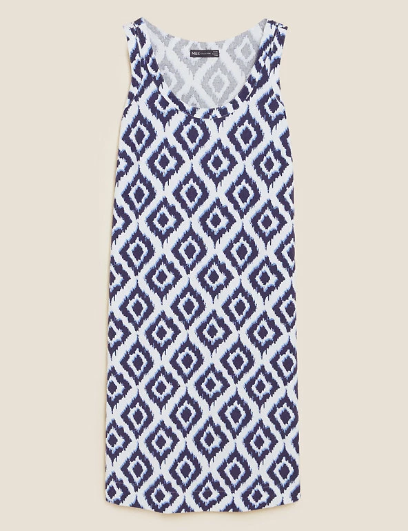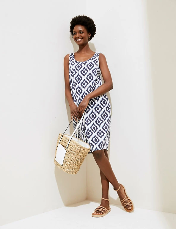Crafted from a light linen-blend fabric, this printed shift dress is perfect for warmer days. It’s designed in a comfy regular fit with a feminine scoop neckline. The versatile knee length and sleeveless silhouette keep it breathable. Made with sustainably sourced viscose.