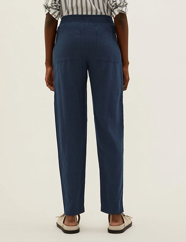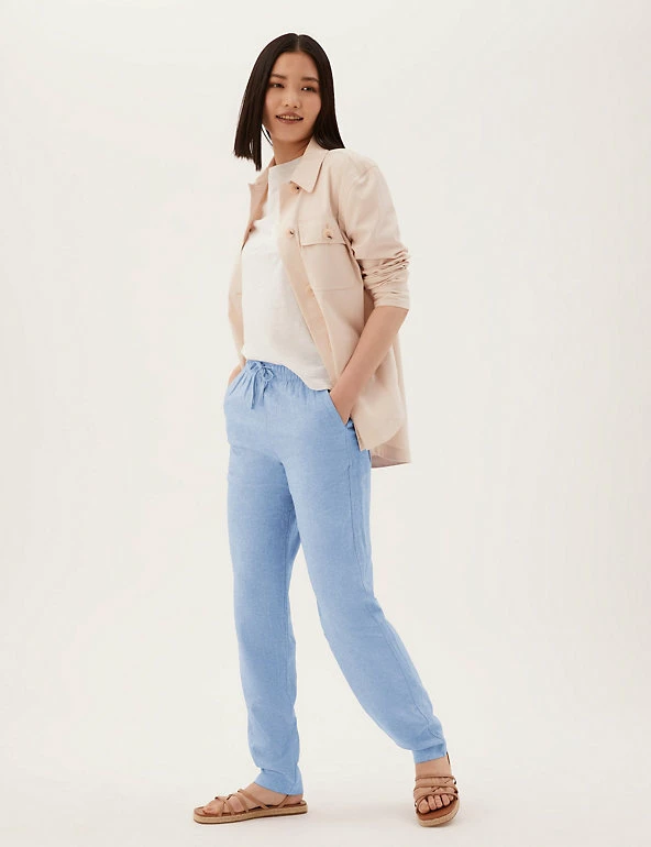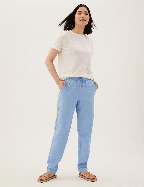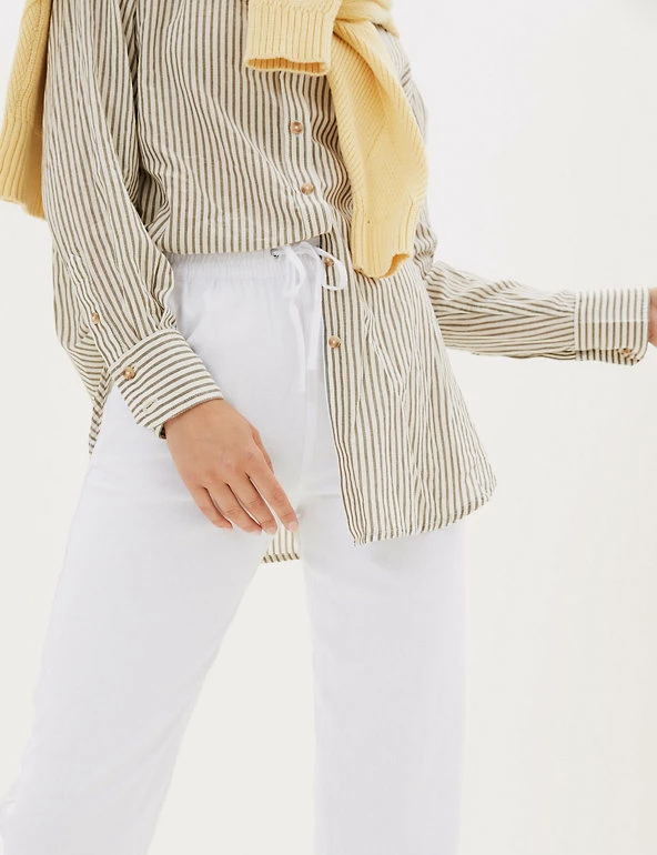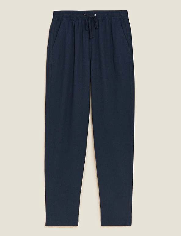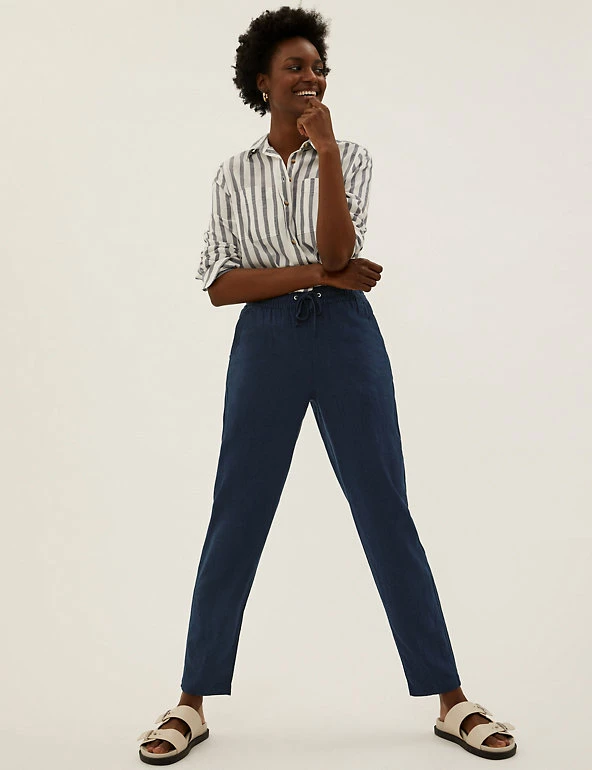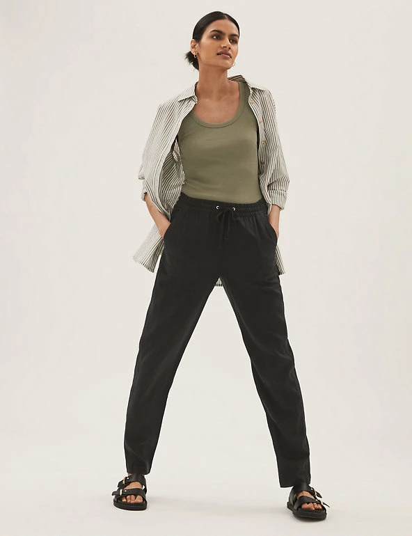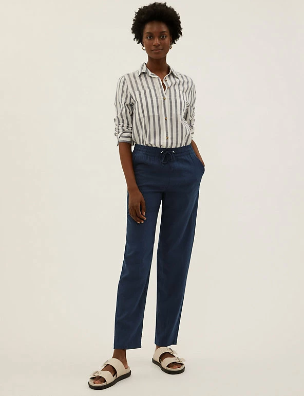In a pull-on style, these linen-rich trousers will take you from desk to dinner. They’re cut to a tapered fit and sit comfortably at mid-rise with a drawstring, elasticated waist. The ankle-grazer length and gentle gathering at the top add to the smart-casual feel.