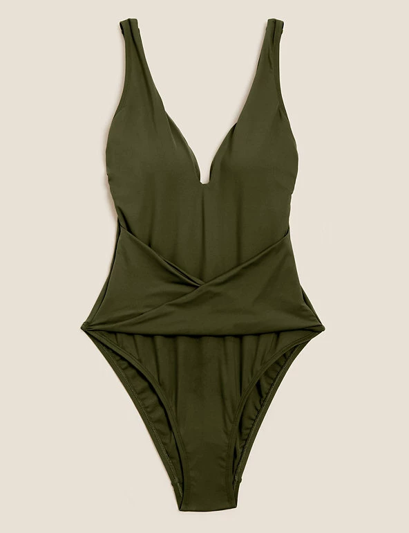 A sophisticated plunging v-neck and cross-over detailing lend a flattering look to this classic swimsuit. Regular-fit design with padding to enhance your natural shape. Non-wired with added stretch for all-day comfort. Fabric has our chlorine-resistant StayNewโข finish so it looks like new for longer.