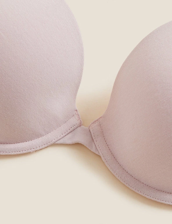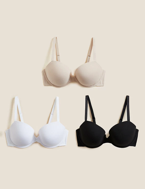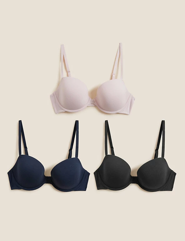 Stock up on comfortable, everyday essentials with this 3-pack set of cotton-mix t-shirt bras. Balcony style, with a slight plunge at the front. wired, lightly padded cups ensure an uplifted, smooth silhouette. We only ever use responsibly sourced cotton for our clothes.