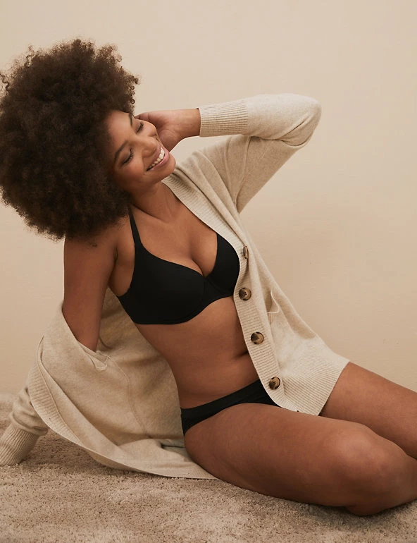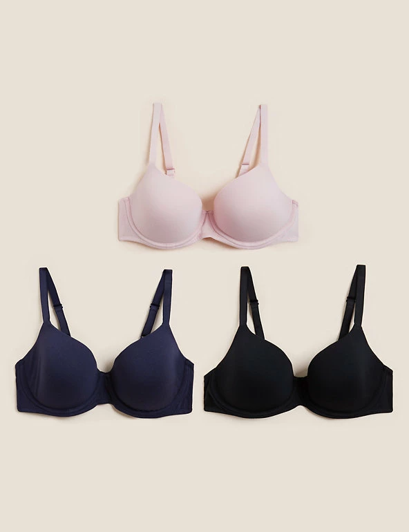These cotton-rich t-shirt bras are padded for a smooth outline beneath form-fitting clothes. The full cups are wired for a comfortably supportive fit. Handy three-pack contains a mix of colours. We only ever use responsibly sourced cotton for our clothes.