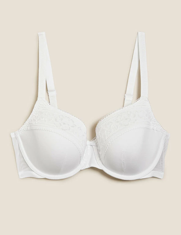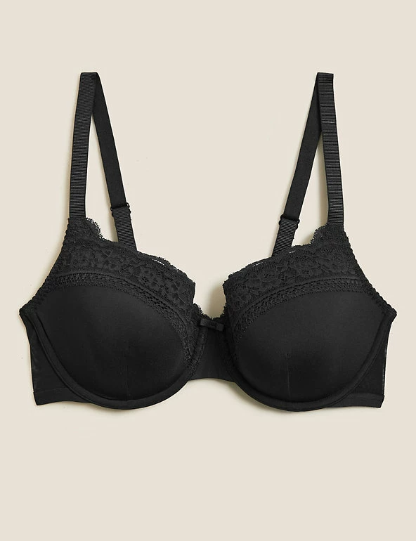 This bra offers pretty, feminine touches with a modern aesthetic. Full cup coverage, with underwire and padding for an uplifted shape. Lace trim and centre bow detailing.