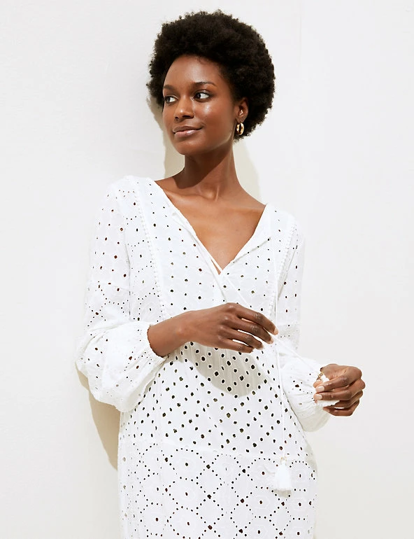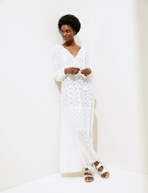 All-over cutwork detailing and embroidery gives this maxi dress a striking finish. It has a regular fit, with an elegant v-neck that’s tied with a tassel cord for added charm. Long sleeves and a waisted shape create a sophisticated silhouette.