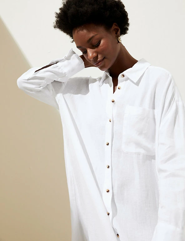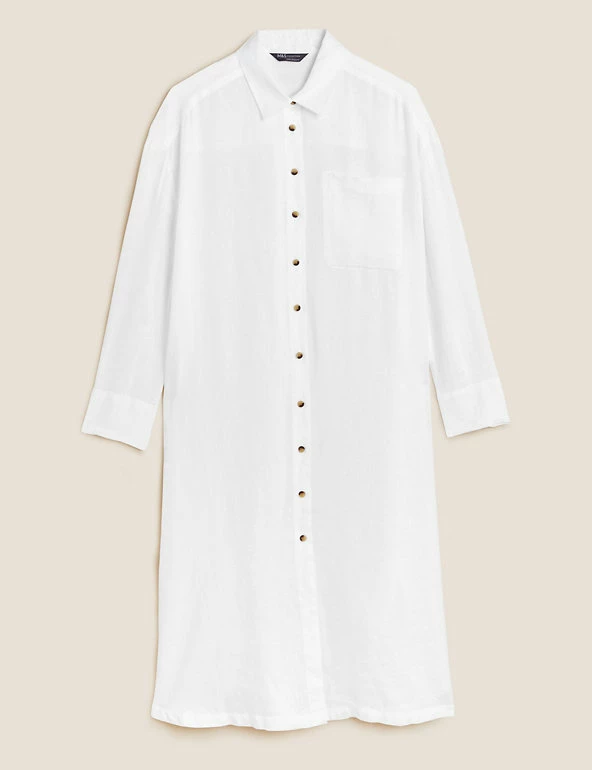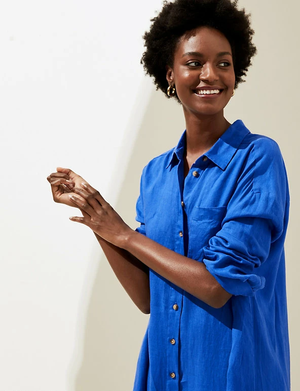 This elegant pure linen shirt dress will become your go-to for beach days. The comfy oversized cut, versatile midi length and three-quarter sleeves make it super-flattering, while the collared neck adds a refined touch. It’s finished with a button-through closure and a handy chest pocket.