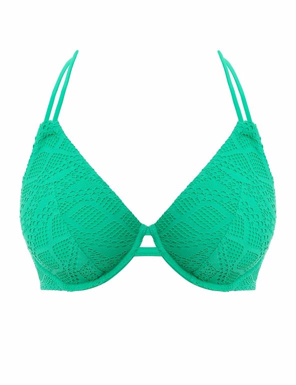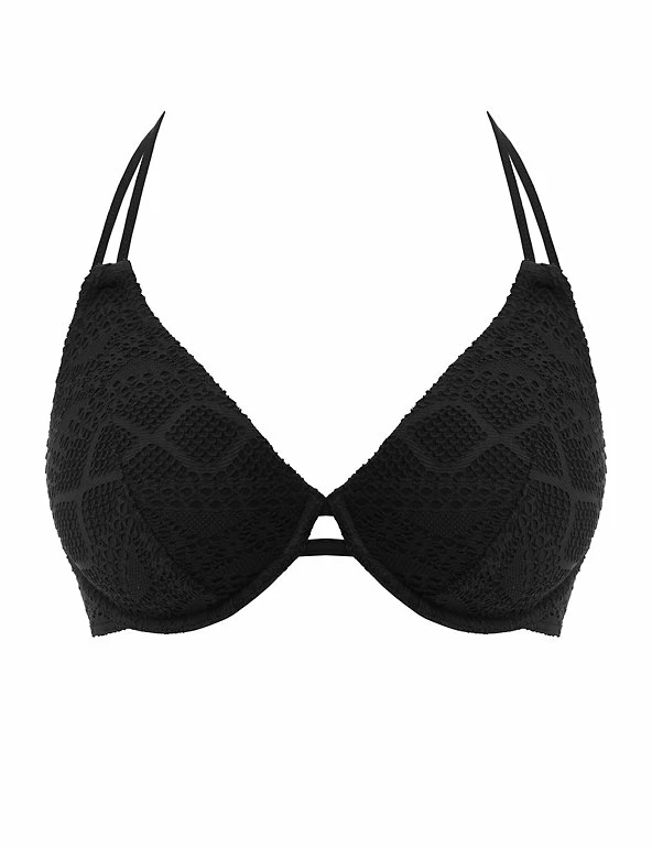 Make a splash on warmer days in this halterneck bikini top from Freya. It’s cut with a flattering low plunging neckline and features powernet-lined cups for a smooth shape. The skinny straps tie at the neck for an adjustable fit and feature luxe metal beads at the ends. This supportive underwired design features a clasp closure and pretty crochet overlays.