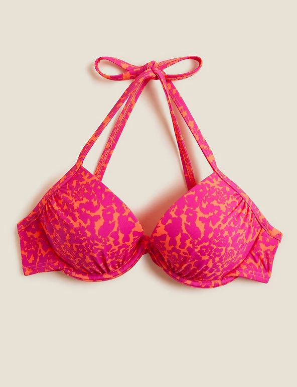 When summer calls, this animal print bikini top answers. It’s cut in a regular fit with a plunging v-neck for striking shaping. Underwired and padded cups, with adjustable tie straps and added stretch for comfort.