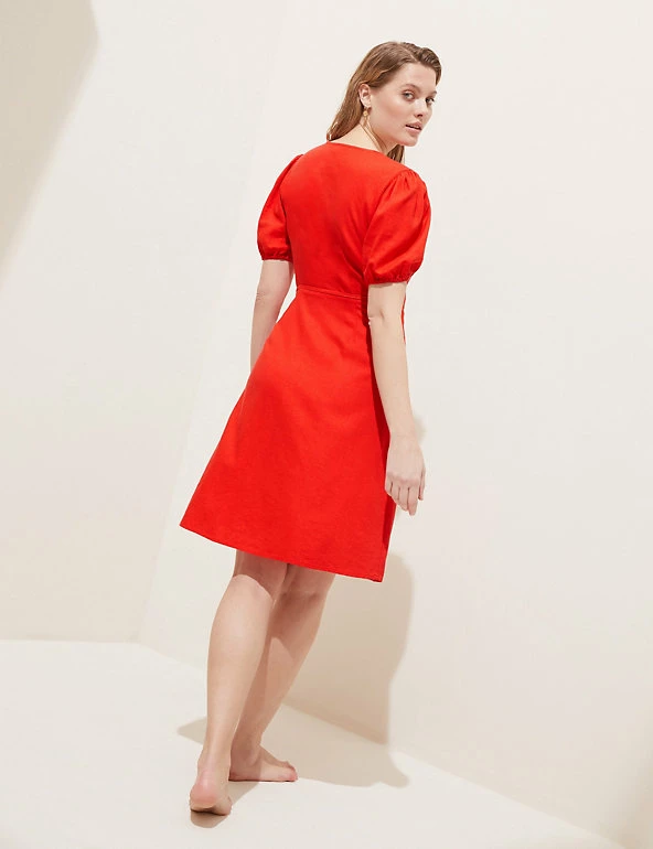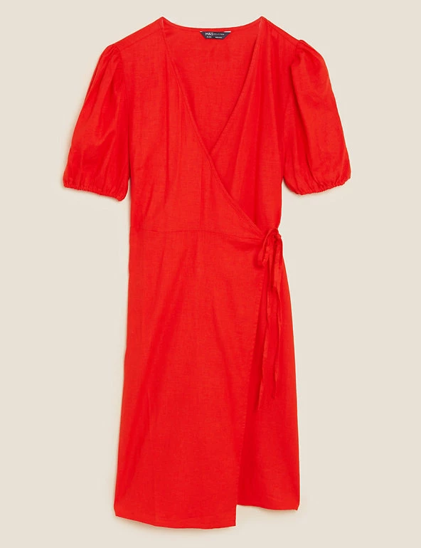 Bring a bright pop to a sunny day with this wrap dress, made from breathable linen-blend fabric. This mini style is cut in a regular fit with a flattering tie waist. The v-neck and short sleeves give an airy finish. Made with sustainably sourced viscose.