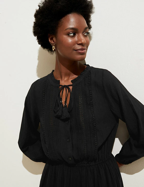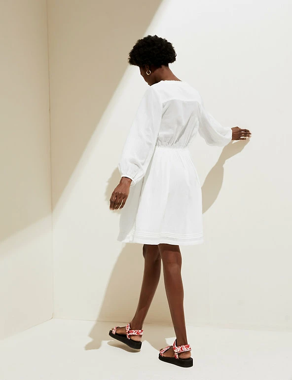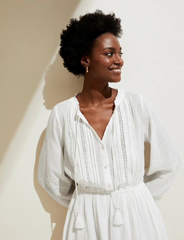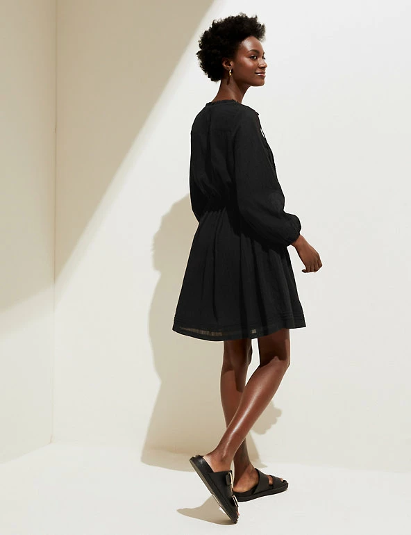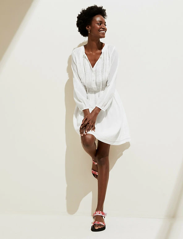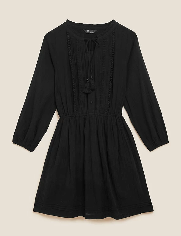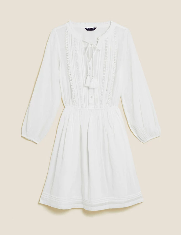 This pretty pure cotton waisted dress features delicate cut-out embroidery. It’s designed in a comfy regular fit and has a playful tassel tie on the v-shaped neck. A mini length and three-quarter sleeves add to the elegant look.