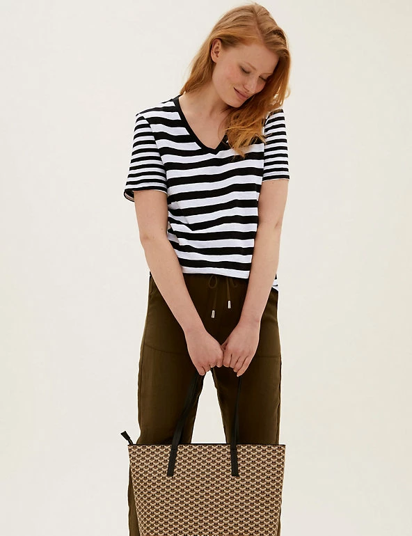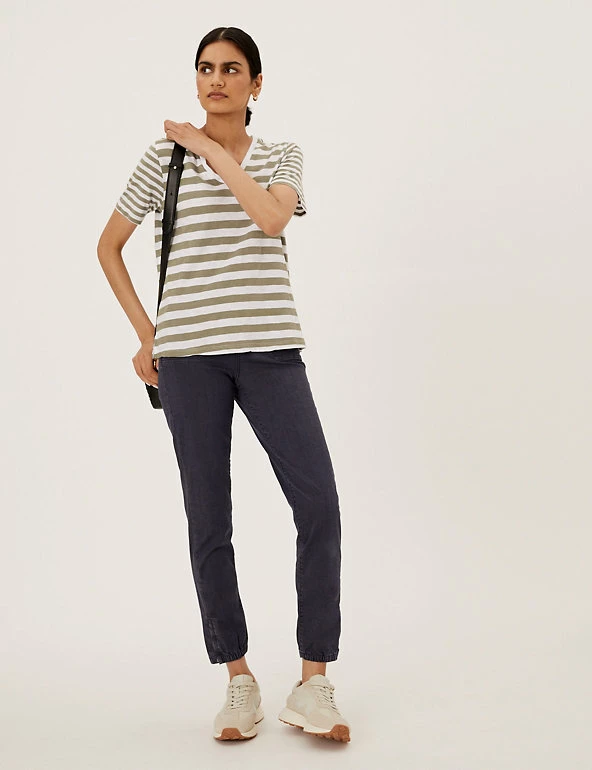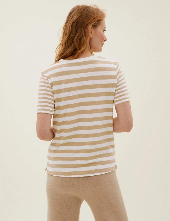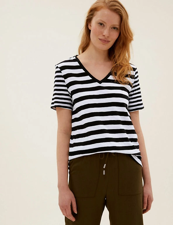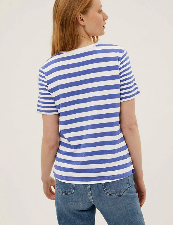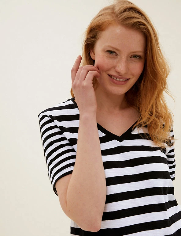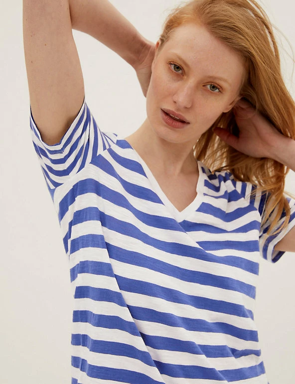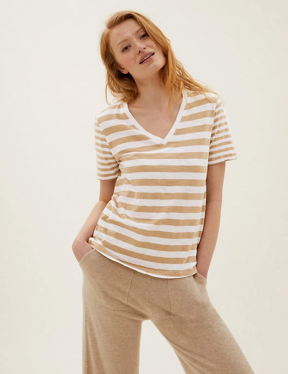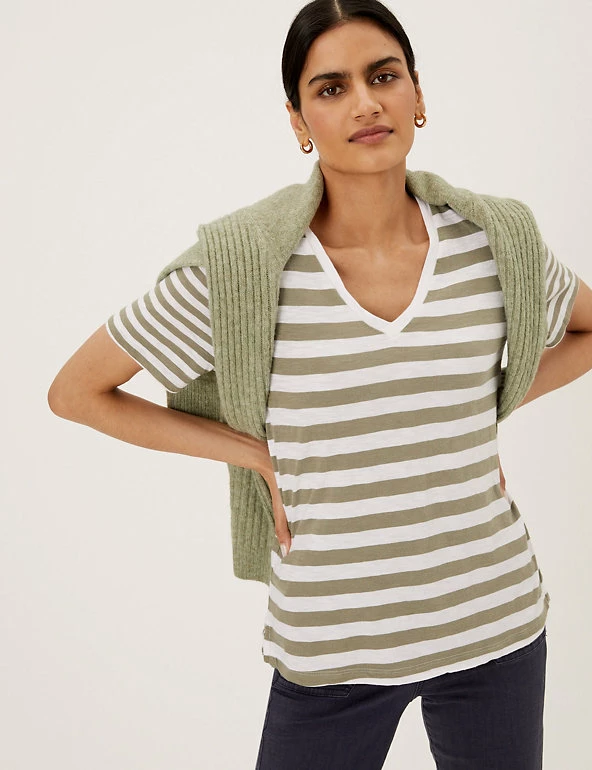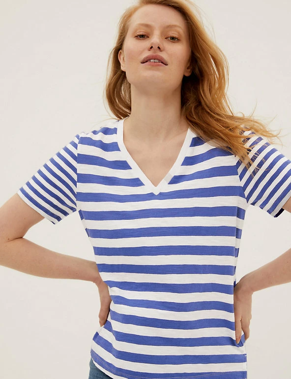 This easy-going t-shirt is designed with relaxed weekends in mind. A roomy straight fit and a V neckline. Classic stripe print. We only ever use responsibly sourced cotton for our clothes.
