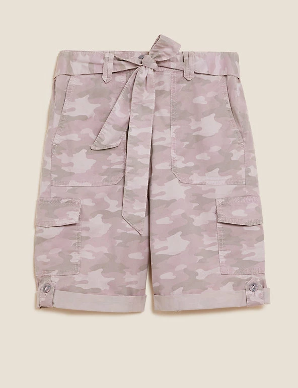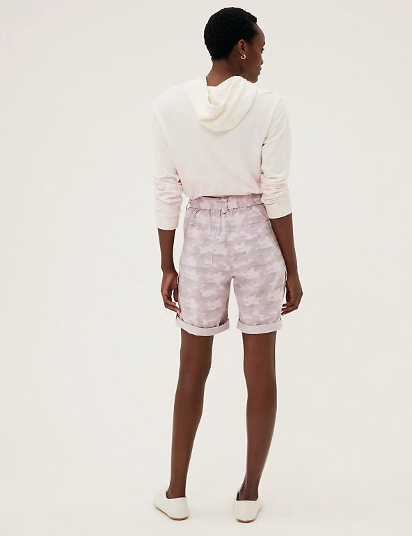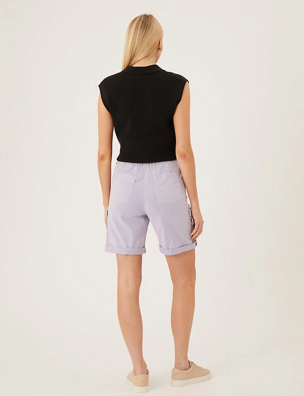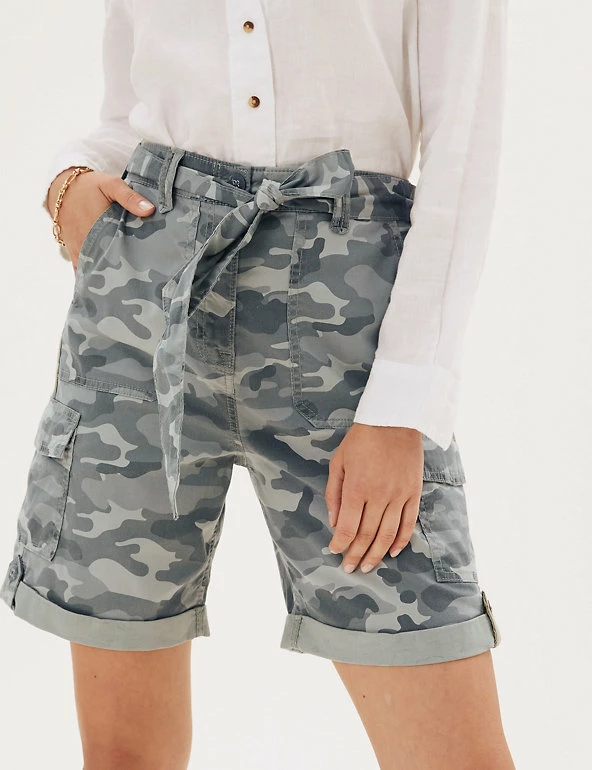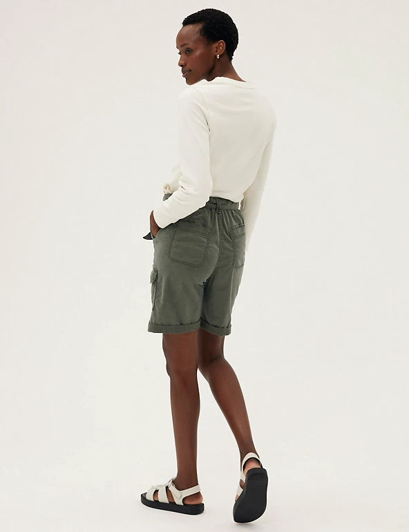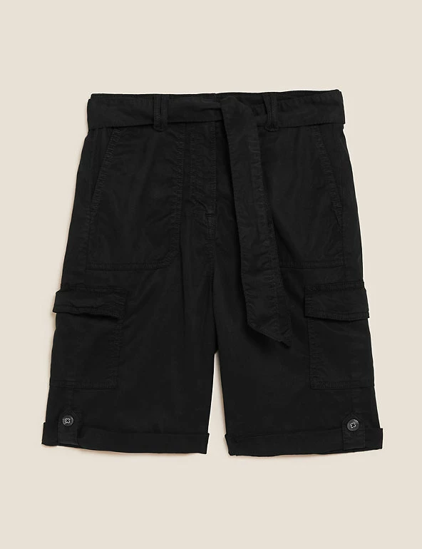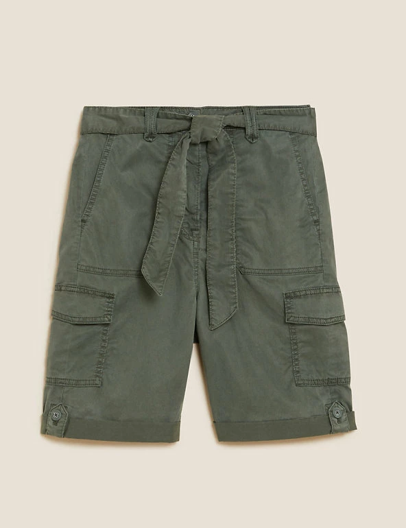 Give warm weather looks a utilitarian edge with these cotton-blend cargo shorts. Flattering high-waisted style, with added stretch for comfort. They combine functional cargo pockets and a buttoned roll hem with a feminine tie belt.
