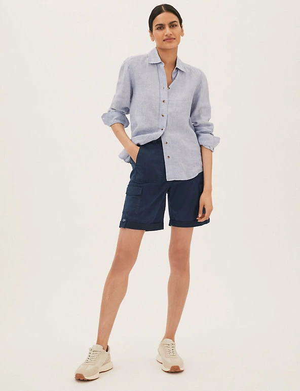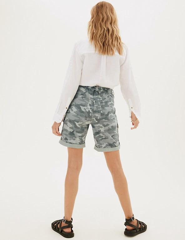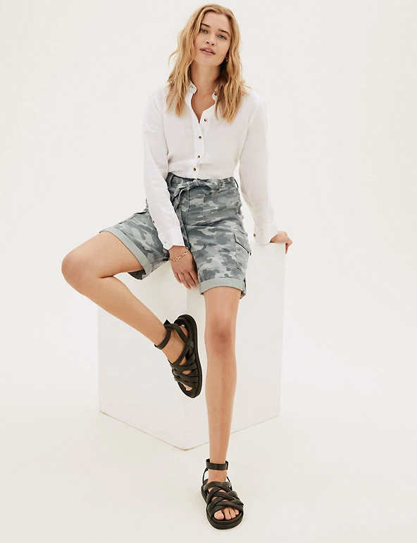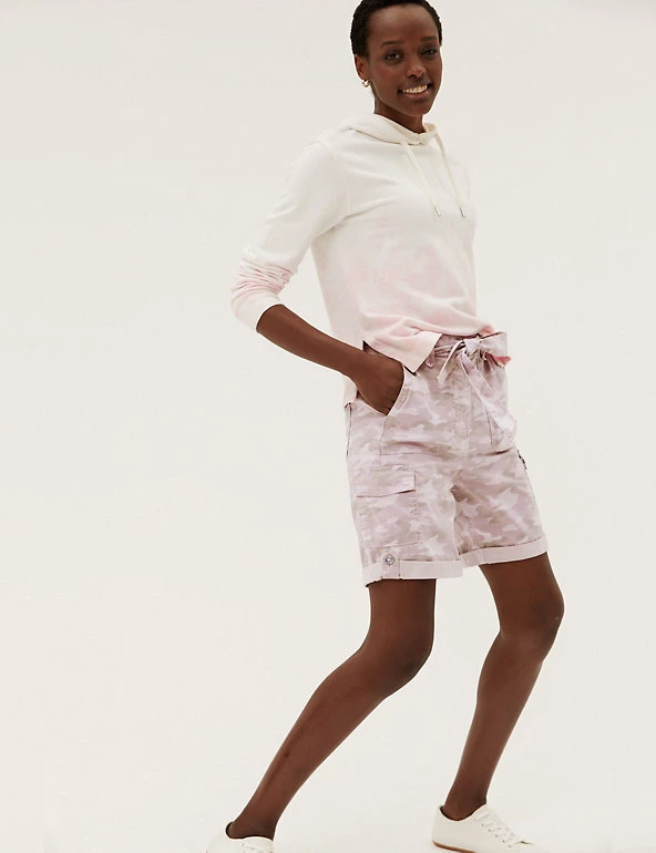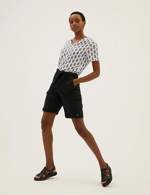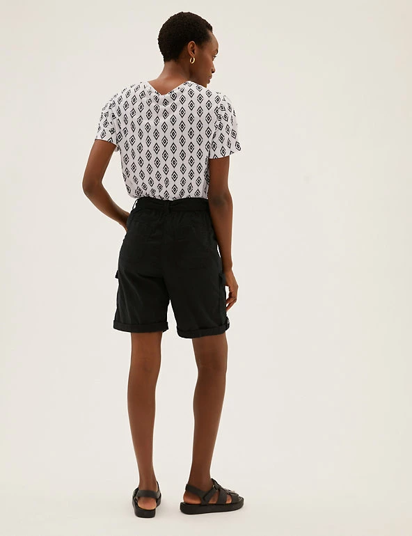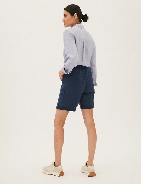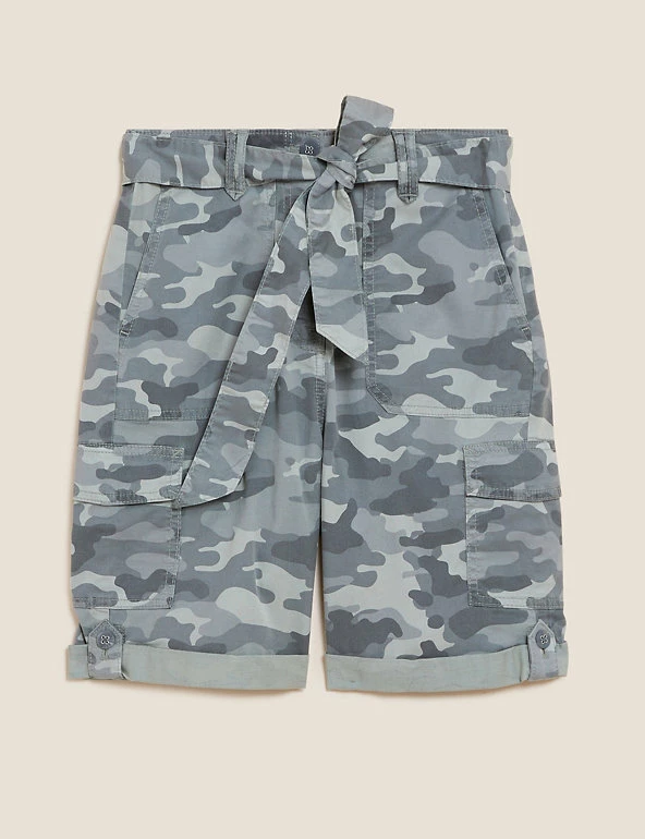 Give warm weather looks a utilitarian edge with these cotton-blend cargo shorts. Flattering high-waisted style, with added stretch for comfort. They combine functional cargo pockets and a buttoned roll hem with a feminine tie belt.