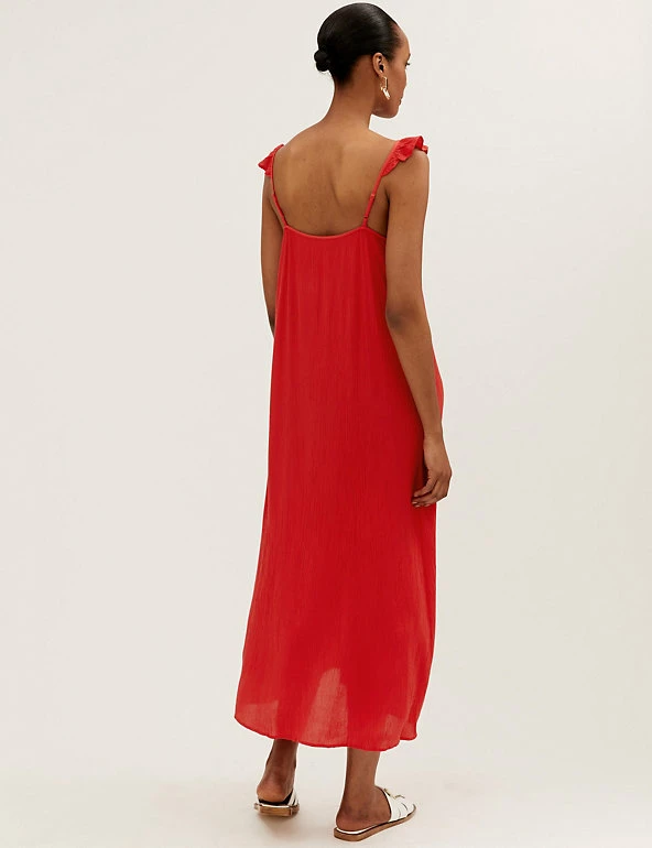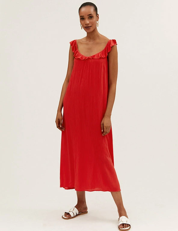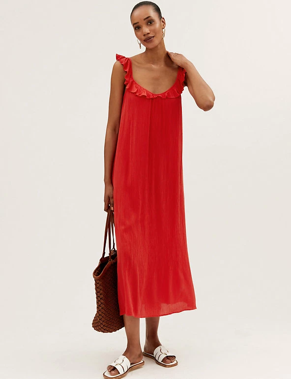With its floaty fabric and midaxi hem, this slip dress is perfect for twirling at parties. It’s designed in a breezy relaxed fit with a strappy sleeveless shape. The classic v-neckline is trimmed with ruffles for a feminine flourish.