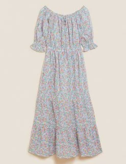 Cheapest 🛒 M&S Collection 👗 Dresses Pure Cotton Floral Bardot Midi Beach 👗 Dress 👏