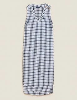 Cheapest π M&S Collection π Dresses Linen Blend Checked V-Neck Midi Shift π Dress βοΈ