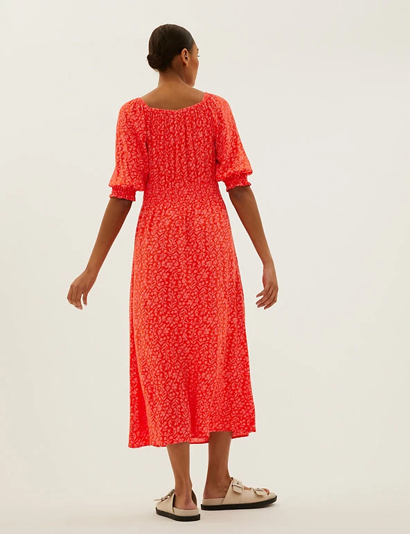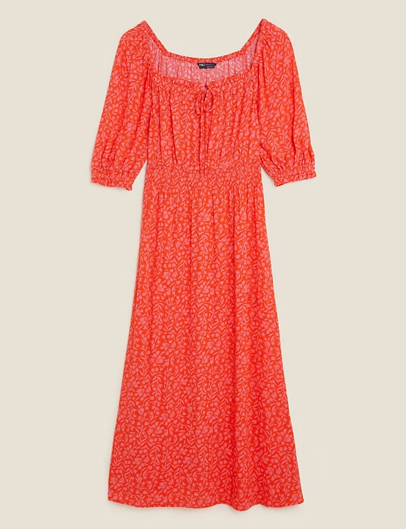 Step into summer with this printed midi dress. It has a regular fit with a flattering shirred waist and voluminous 3/4 length sleeves for a striking silhouette. The notch neck features a self-tie fastening for custom wear. Ruffles at the cuffs and around the squared neckline add a final flourish. Made with sustainably sourced viscose.