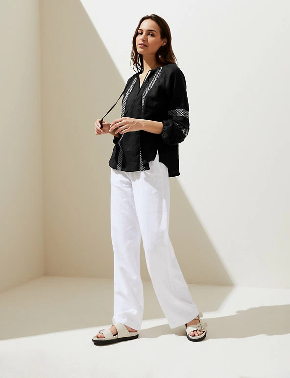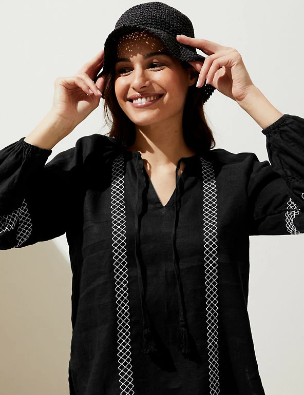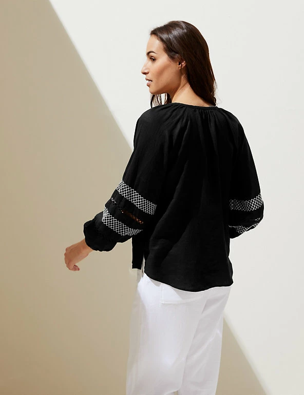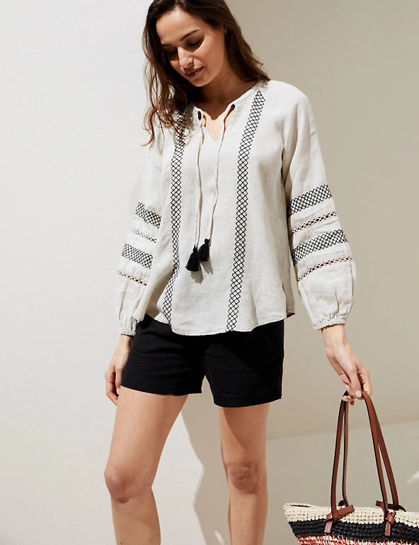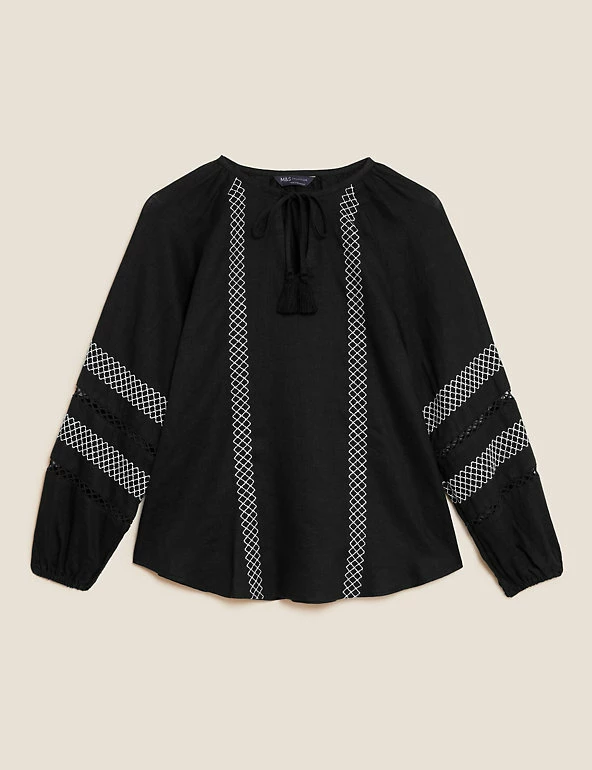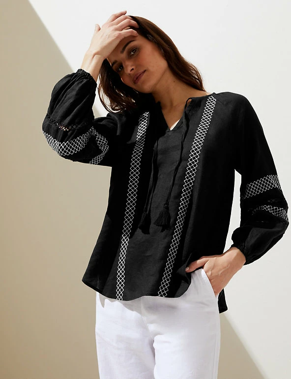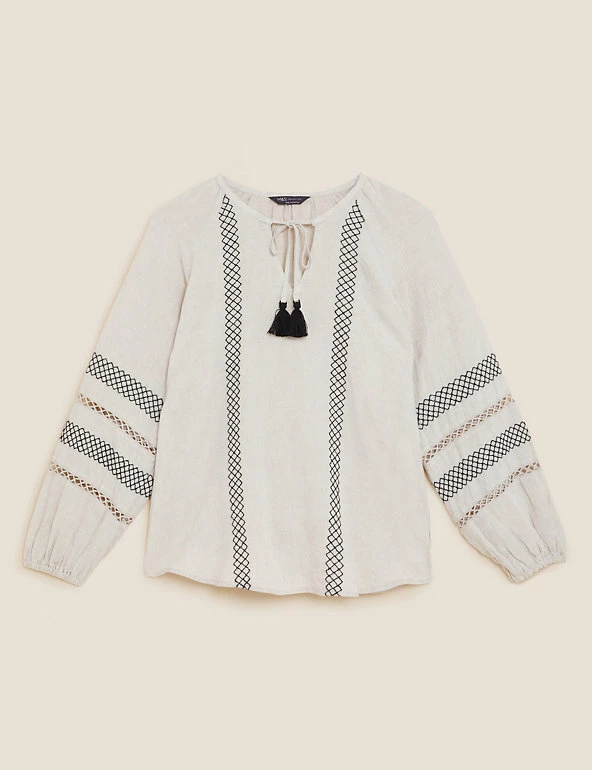 Bring some boho charm to off-duty looks with this pure linen blouse. Regular fit, with long sleeves and elasticated cuffs for comfort. Adjustable tie-neck fastening decorated with tassels. Contrasting embroidery on the front and sleeves adds a textured finish.