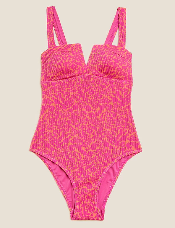 Make a splash in more ways than one with this animal print swimsuit. Regular fit, with a ribbed texture and plunging, notched v-neck detail at the front. Non-wired cups are padded for a smooth outline and gentle support. Our clever chlorine-resistant StayNew™ fabric means your swimsuit will keep its shape and flattering fit for longer.