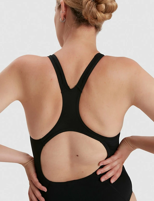 Dive into the pool looking on-trend in this sleek swimsuit from Speedo. With its classic scoop neck cut, this high-performance piece instantly flatters your silhouette. Thanks to innovative chlorine-resistant fabric, it’ll keep its colour and feel for longer. Made with recycled polyester.