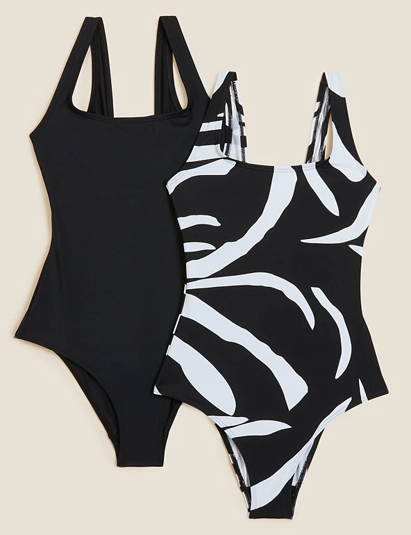 Make double the splash with this pack of two swimsuits. These plain and animal print styles are cut in a flattering regular fit, with a classic scoop neck and non-padded, non-wired cups. Added stretch ensures all-day comfort, and our clever StayNew™ chlorine-resistant fabric holds its shape for no sagging or bagging.